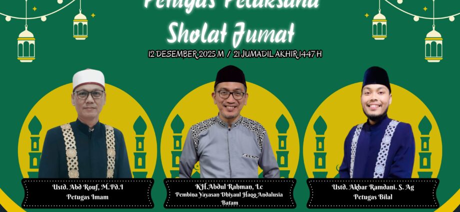 Petugas Shalat Jumat, 21 Jumadil Akhir 1447 H / 14 Desember 2025 :Imam : Ust. Abd Rouf, M.Pd.IBilal : Ust. Akbar Ramdani, S.AgKhatib : KH. Abdul Rahman, Lc (Pembina Yayasan Dhiyaul Haqq Andalusia Batam) “Perbanyaklah shalawat kepadaku pada setiap Jum’at. Karena shalawat umatku akan diperlihatkan padaku pada setiap Jum’at. BarangsiapaBaca Lebih Lanjut >>